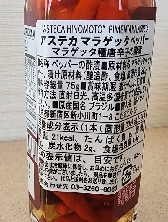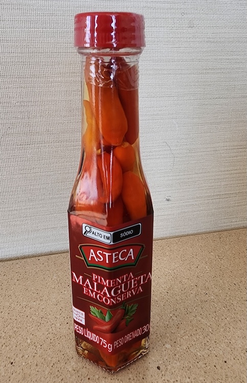 アステカというブランドの『マラゲッタペッパー(マラゲッタ種唐辛子の酢漬け)』というのが日本の商品名です。 現地の商品名は『PIMENTA MALAGUETA EM CONSERVA』。