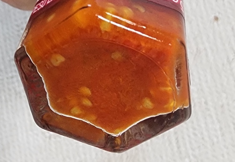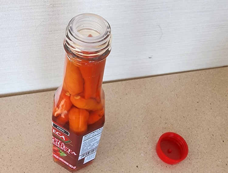 そう、これはペッパーソースではないのです。日本語の商品名にもあるとおり『唐辛子の酢漬け』です。 しかし、個体を使うにはちょっと出しづらい入れ物です。 唐辛子の個体を出そうとして容器を逆さにすると、液体が全部出てしまいますからね…。 “唐辛子の酢漬け”として使うなら、広口の瓶にしてほしかったところ。