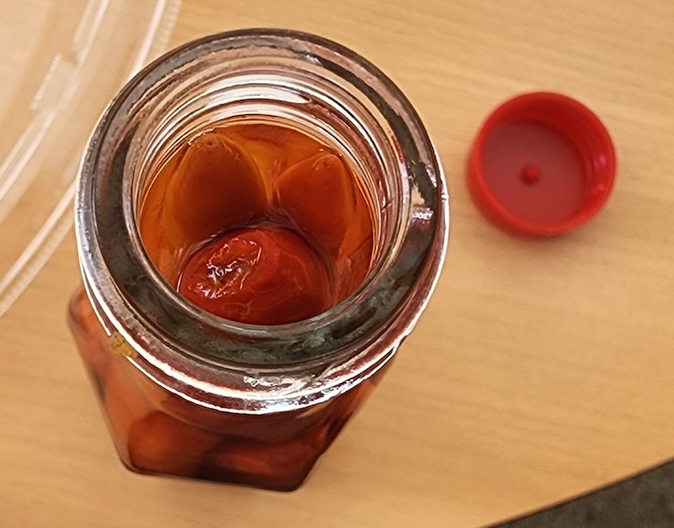 唐辛子の個体と液体を別々に使う方法もありますが、唐辛子はしっかり漬かっているので崩れやすいので、 個体を瓶からほじくり出そうとすると崩れて取り出しにくいです。
