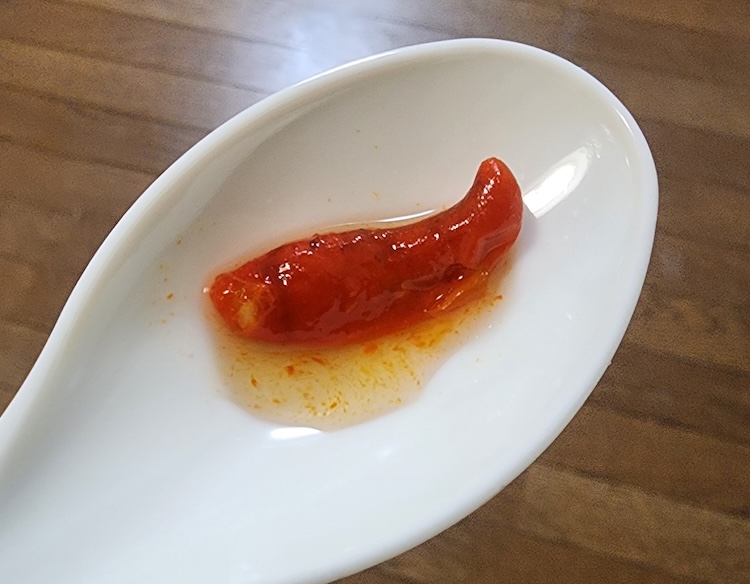 意外と辛い!(唐辛子なのでねw) 激辛系の唐辛子のような強烈な辛さはなく、「普通の唐辛子の辛さ」。ちゃんと辛いです。 かと言って、液体の方に辛味が抜けてしまっている感じはなく、身にもしっかり辛さと風味が残っています。