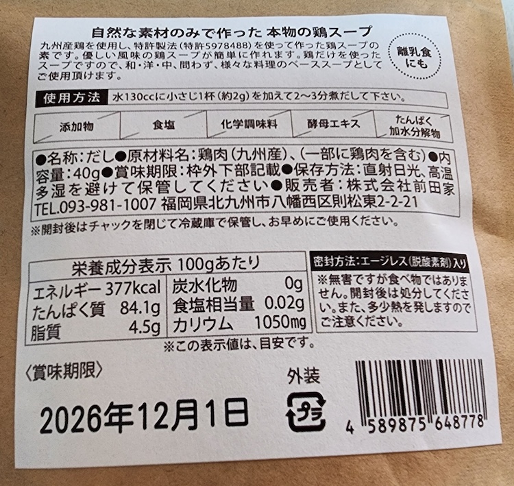 原材料が「鶏肉」となっているので、骨ではなく肉から出汁を取っているのでしょうか。