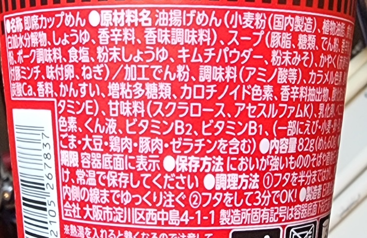 油揚げめん(小麦粉(国内製造)、植物油脂、食塩、たん白加水分解物、しょうゆ、香辛料、香味調味料)、スープ(豚脂、糖類、でん粉、香辛料、小麦粉、ポーク調味料、食塩、粉末しょうゆ、キムチパウダー、粉末みそ)、かやく(赤唐辛子、味付豚ミンチ、味付卵、ねぎ)/加工でん粉、調味料(アミノ酸等)、カラメル色素、酸味料、炭酸Ca、香料、かんすい、増粘多糖類、カロチノイド色素、香辛料抽出物、酸化防止剤(ビタミンE)、甘味料(スクラロース、アセスルファムK)、乳化剤、ベニコウジ色素、くん液、ビタミンB2、ビタミンB1、(一部にえび・小麦・卵・乳成分・ごま・大豆・鶏肉・豚肉・ゼラチンを含む)