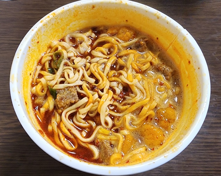 食べる前に混ぜないといけませんが、混ぜると「ぶっかけ唐辛子感」はさらに薄れてしまいました。 混ぜないほが美味しそうに見えたぞー。