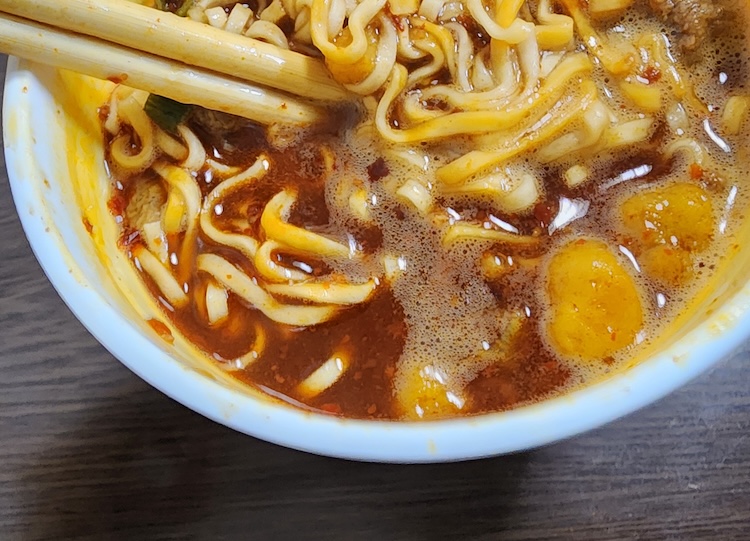 しばらく食べ続けていると辛みもそれなりには感じてくるのですが、それ以上にスープが甘い。麺に糖類は入っていないはずなのに、麺まで甘く感じてくる始末。