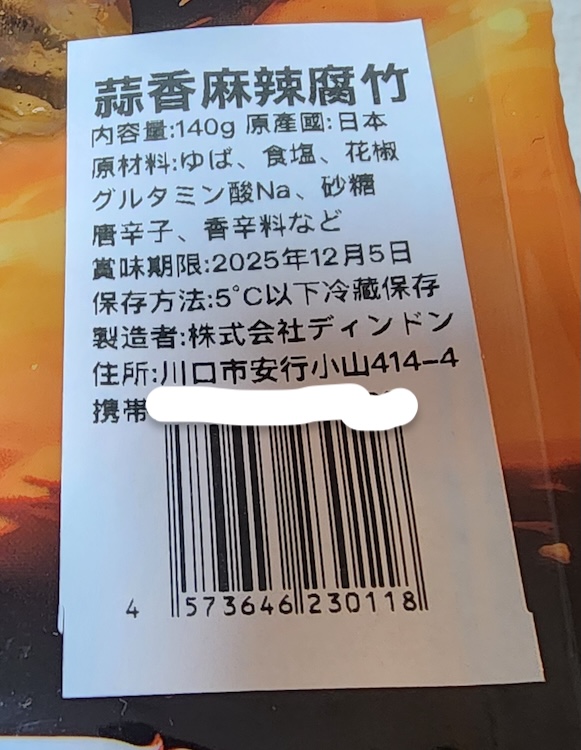 要は、麻辣ガーリック味の湯葉ということになります。けして腐った竹ではありませんよ!(ちなみに、要冷蔵の商品です。)