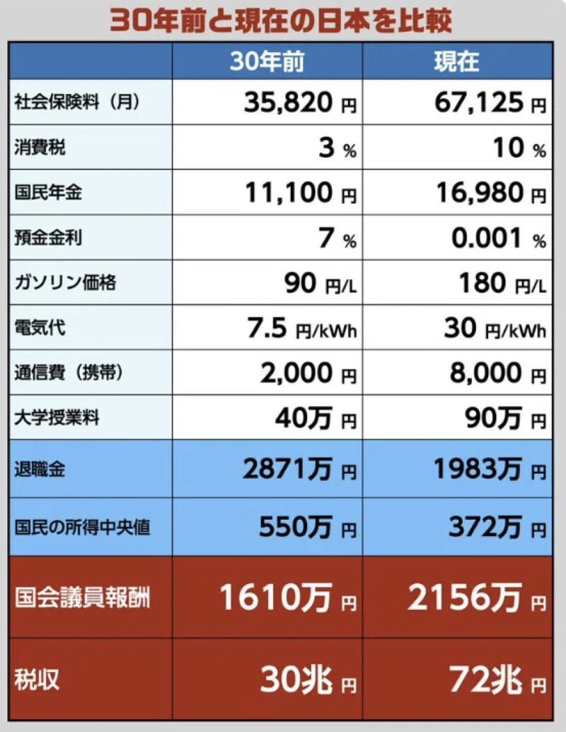税収はここ6年間過去最高値を更新していて、2025年度も過去最高の80兆円になる見通しらしいです。しかし、国民の所得中央値は1995年の545万円から2025年は423万円と122万円も減っているというひどいことになっています。 それでもさらに国民から税金をむしり取ろうとしている追い剥ぎのような国です。