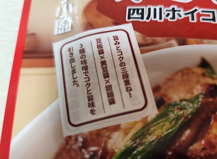 パッケージには、「旨みとコクの三段重ね! 豆板醤 × 黄豆醬 × 甜麺醤 3種の味噌でコクと旨味を引き出しました。」というキャッチコピーが躍っています。