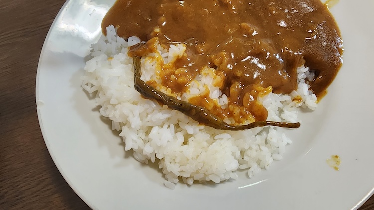 唐辛子を食べてみましたが、唐辛子の味や辛味はルウに溶け出しているのでしょう、辛味はほとんど感じられません。