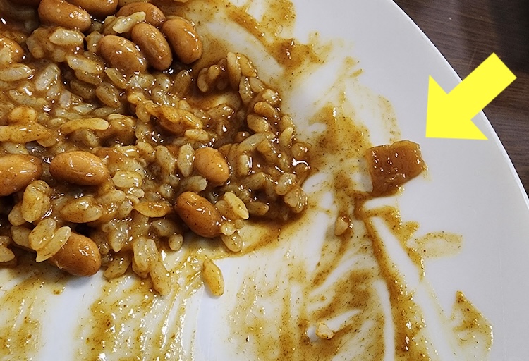 矢印の先にあるのが玉ねぎです。 そのほかに入っているはずの『生姜、人参、にんにく、ココナッツ』は見当たりません。 おそらく煮込まれてルウに溶け込んでいるのでしょう。きっと。