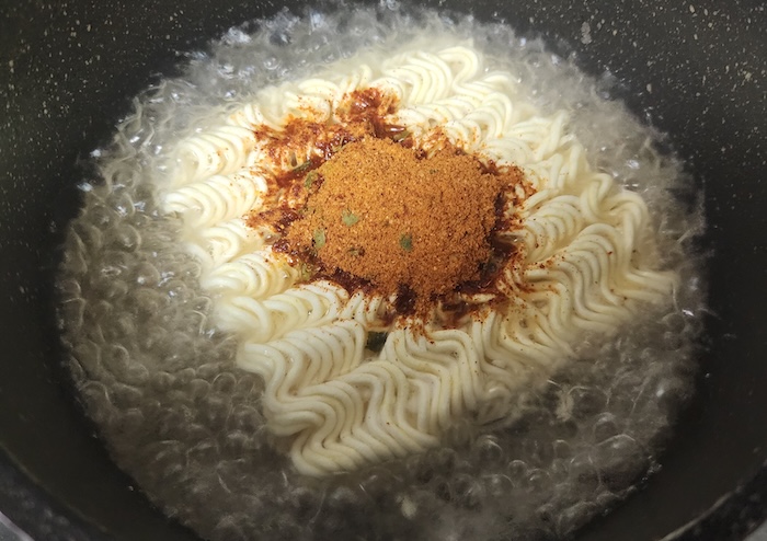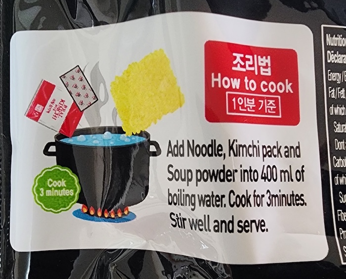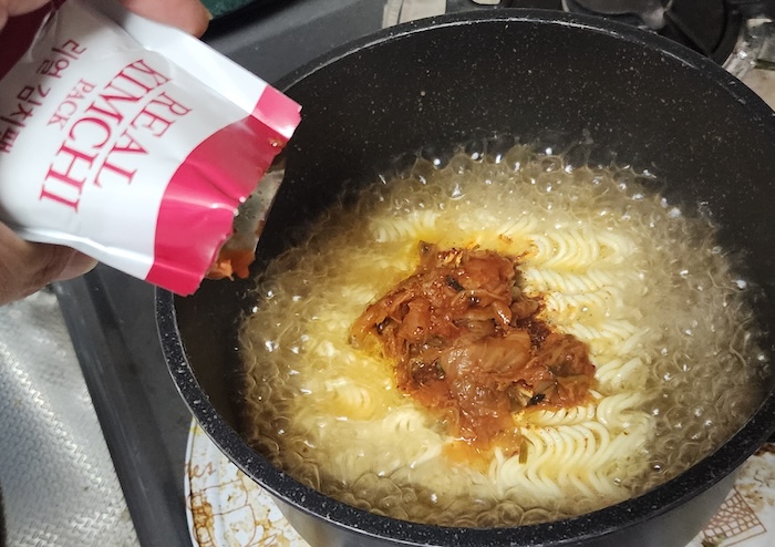 400ccのお湯に麺と粉末スープとキムチを入れて、3分間煮込むだけです。