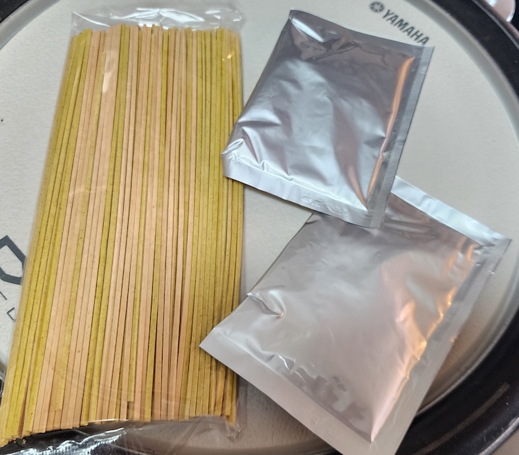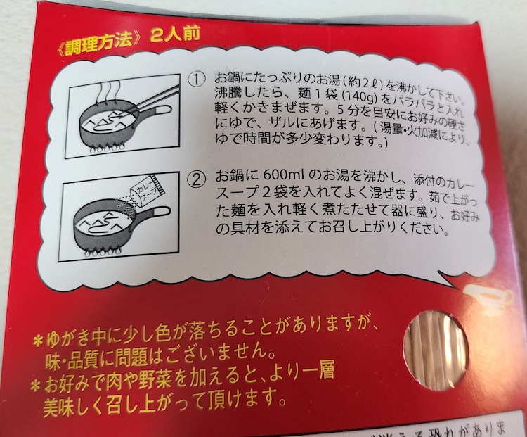 中には2色の乾麺(赤:唐辛子、黄:カレー)と粉末スープが2セット入っています。
