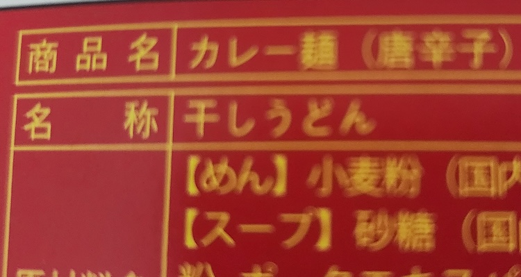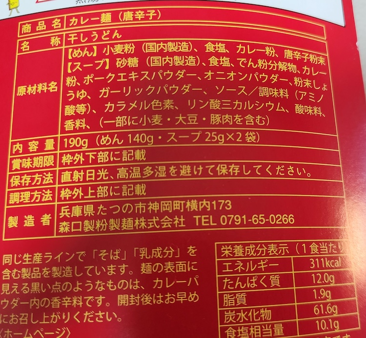 - 衝撃の事実:品名に「干しうどん」の文字が。僕はパッケージ写真から勝手にカレーラーメンだと思い込んでいましたが、実は「カレーうどん」だったのです!