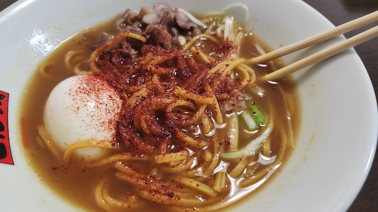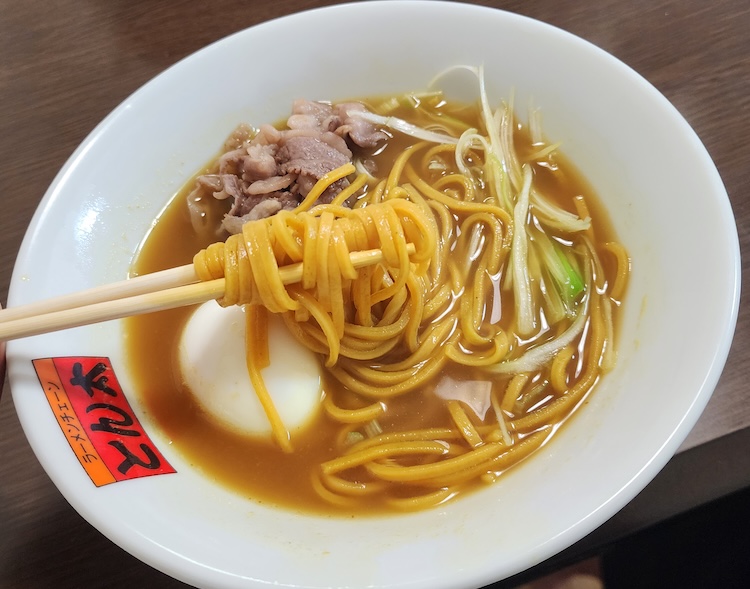 麺だけを食べると、ほんのりスパイスの香りとピリッとした刺激を感じます。でもスープの方が辛味が強くスパイシーなカレー風味があるので、練り込みの効果は体感できませんでしたが、きっと隠し味になっているんだと思います。