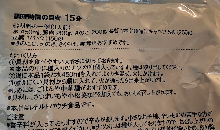 パッケージには肉や野菜の目安量が書かれていますが、そこは鍋料理。希釈する水の量(450cc)だけはしっかり守り、具材はてきとーに家にあったものを入れることにしました。