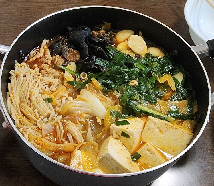 出来上がったスープは、パッケージ写真の赤々とした印象とは違い、それほど辛そうな色ではありません。原材料で最も多いのは大豆油とのことでしたが、中国の火鍋のようなギラギラした油感もなく、見た目はあっさりしています。