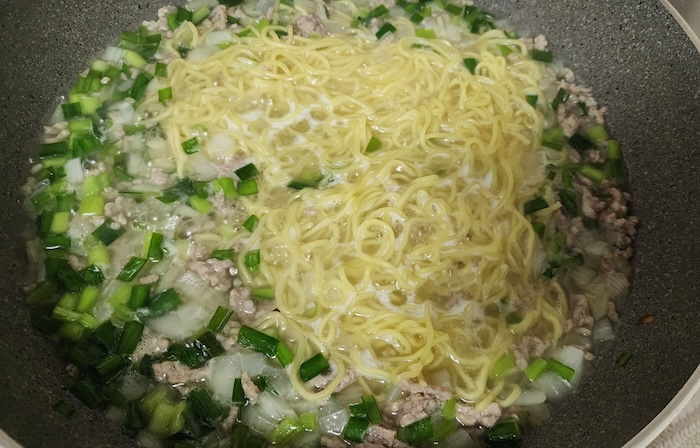 2)肉に火が通ったら水を400cc入れ、沸騰したら麺を入れて中火〜強火で4分間煮込みます。