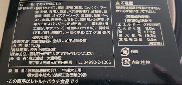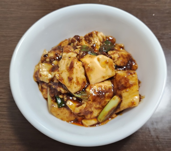 醤油ベースで、砂糖も多めです。花椒が使われてはいるものの、オイスターソース、甜麺醤、はちみつ、生姜ペーストが入っていて、完全なる日本風麻婆豆腐なのが原材料からもわかります。