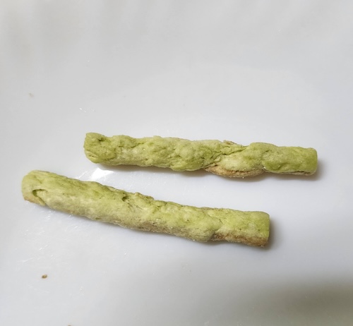 イオンの『トップバリュ』ブランドの商品です。製造しているのは広島県福山市の藤庄というメーカーです。 なんと4種の野菜(かぼちゃ、ほうれんそう、トマト、オニオン)のパウダーを練り込んだスナック菓子です。 生地は小麦粉とじゃがいも(甘薯澱粉、馬鈴薯でんぷん、ポテトフレーク)です。 しかし!!『塩だけで味付けした』とありつつ、グラニュー糖も使われています。(おいおい!しかも、塩より多いじゃん!)