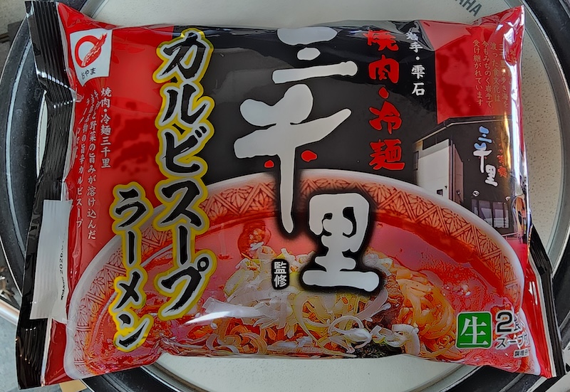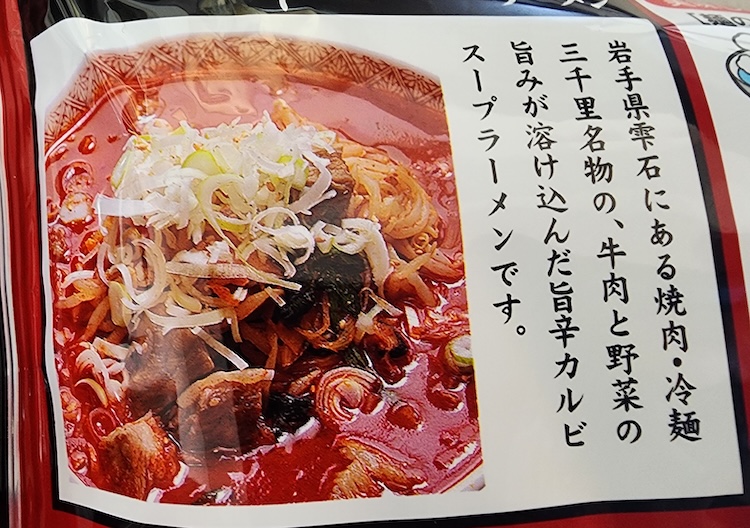 岩手県雫石町にある焼肉店「三千里(さんぜんり)」の名物、カルビスープラーメンの袋入りインスタント麺(生麺・液体スープ付)を買ってきました。