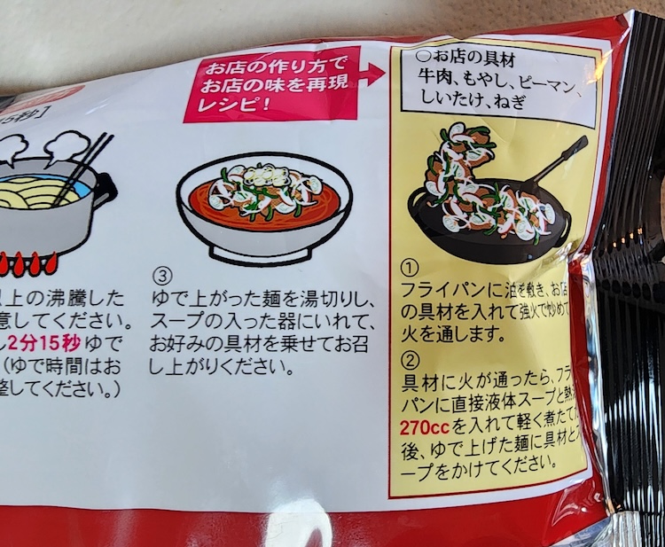 通常の作り方としては、麺を別茹でし、丼に液体スープを入れ270ccの熱湯で薄め、麺を入れて、好みの具材を乗せてできあがりという感じですが、『お店の作り方でお店の味を再現レシピ』というのがパッケージに書いてあったのでその作り方をしてみようと思います。